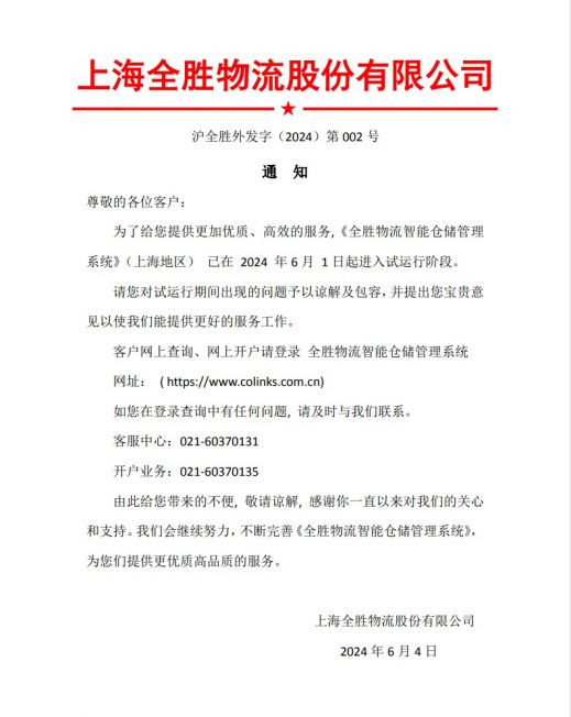全勝智能倉儲管理系統(tǒng)試運(yùn)行通知